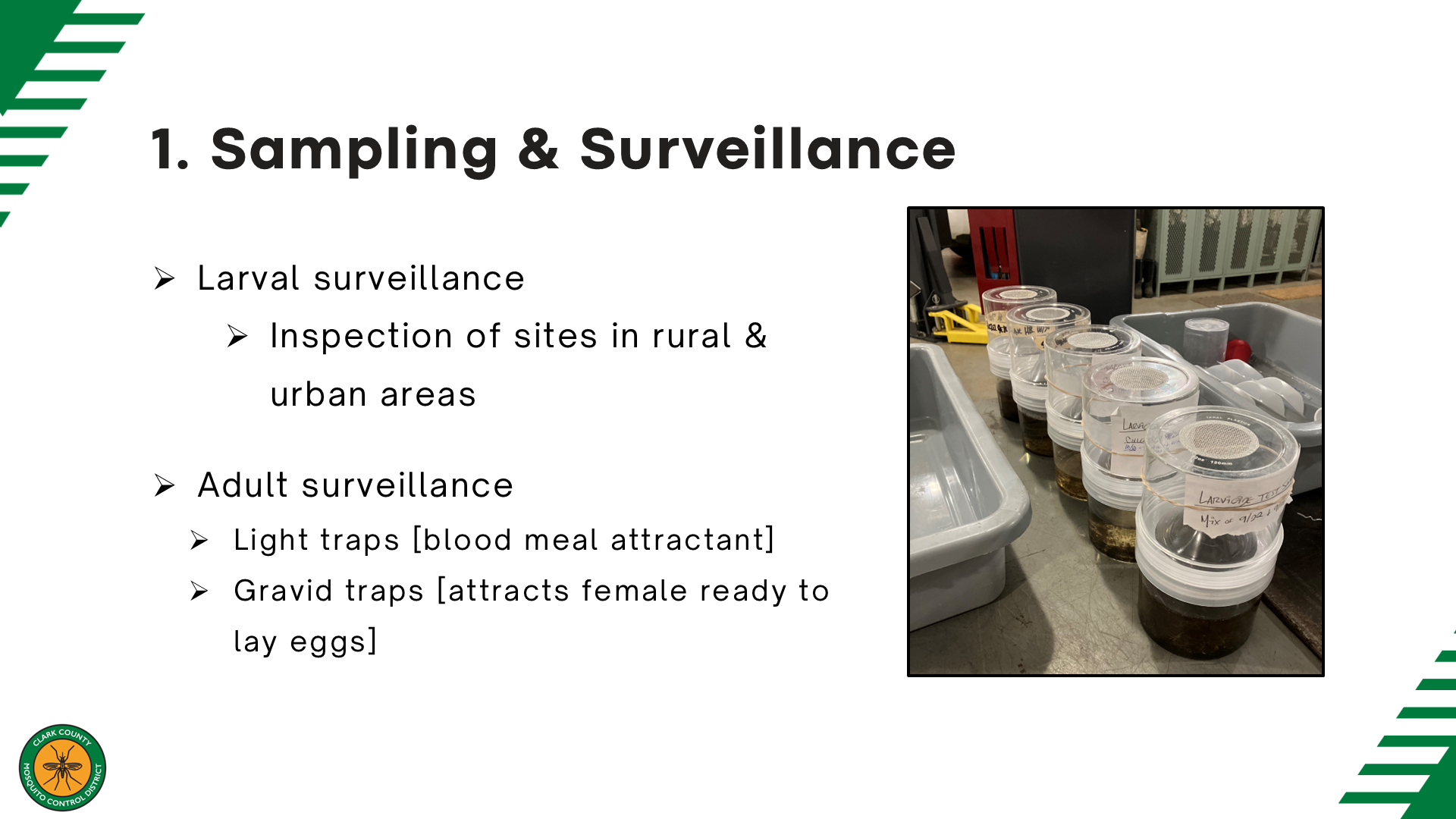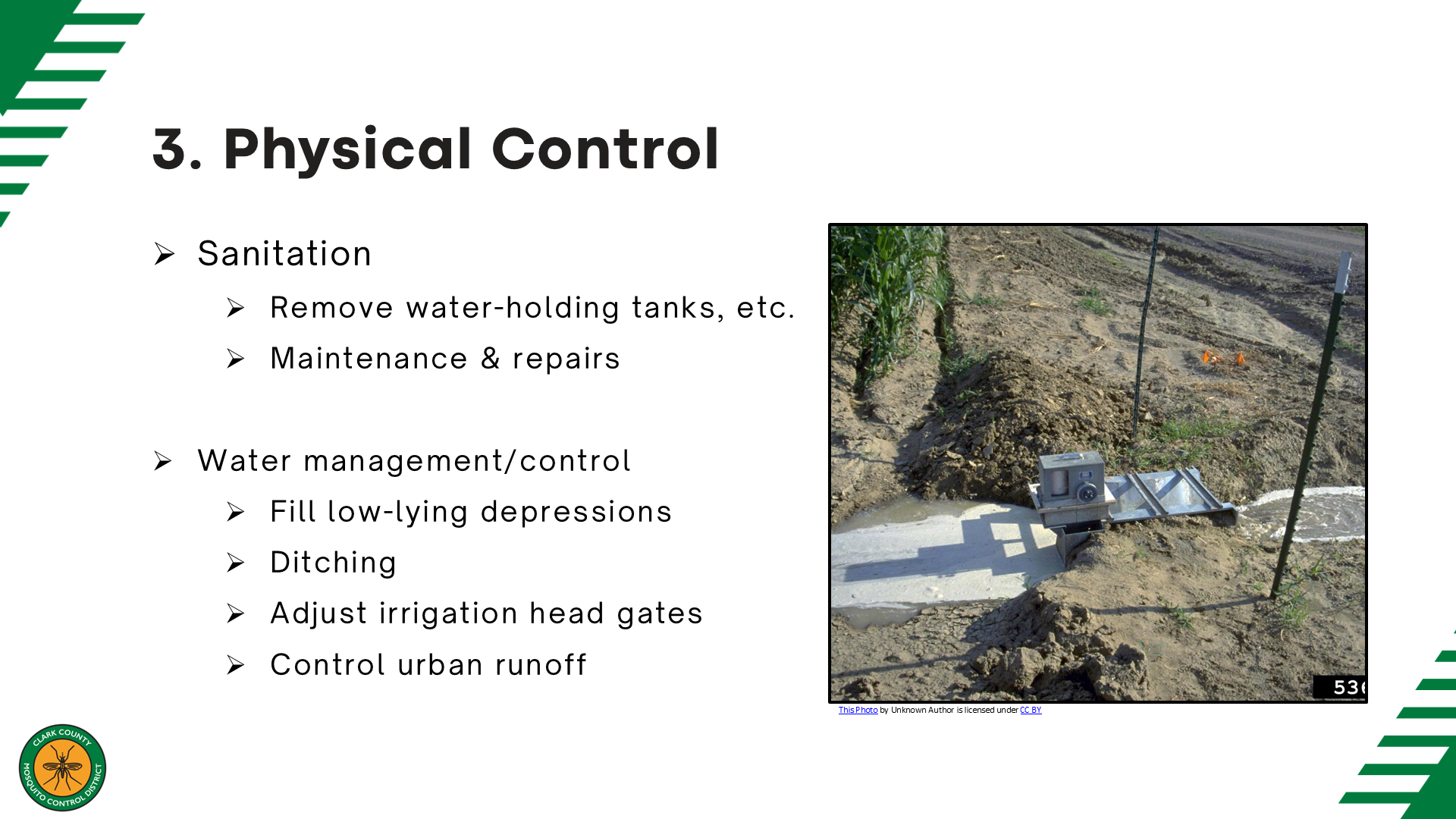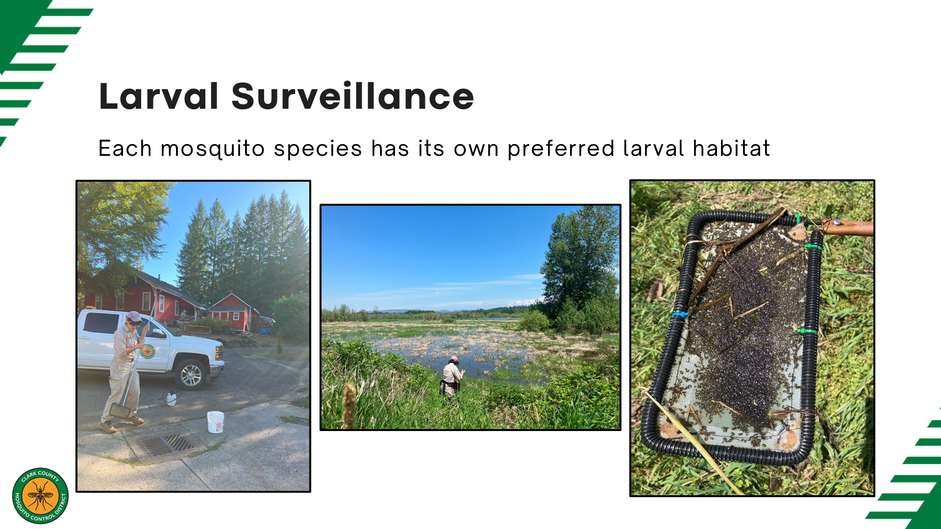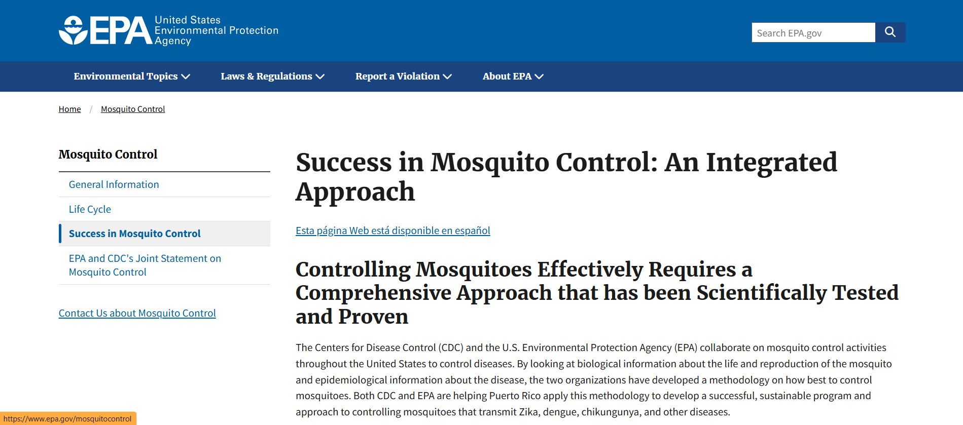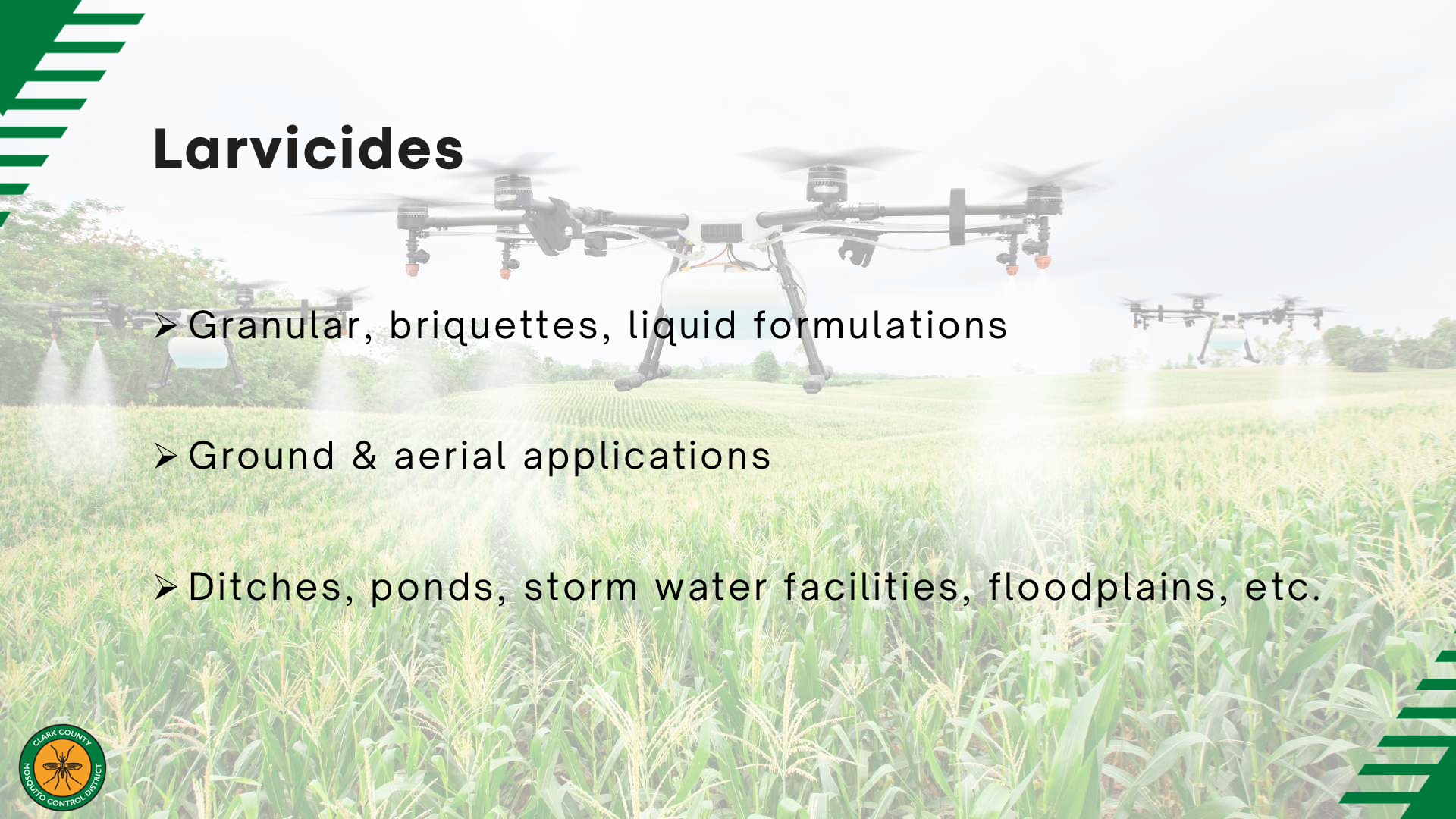 - Treating water sources with environmentally targeted larvicides to stop mosquitoes in their early life stages before they become biting adults.