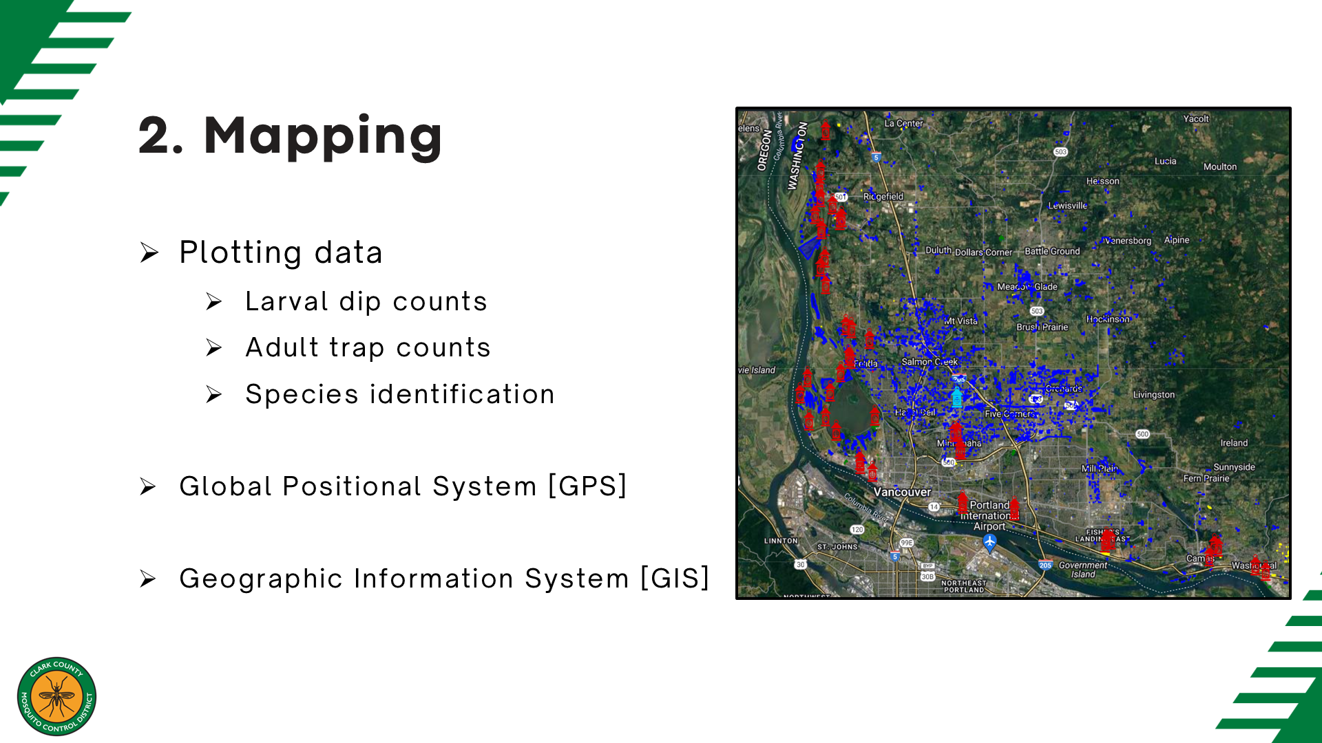 Tracking mosquito populations, breeding sites, and disease activity to guide decisions.