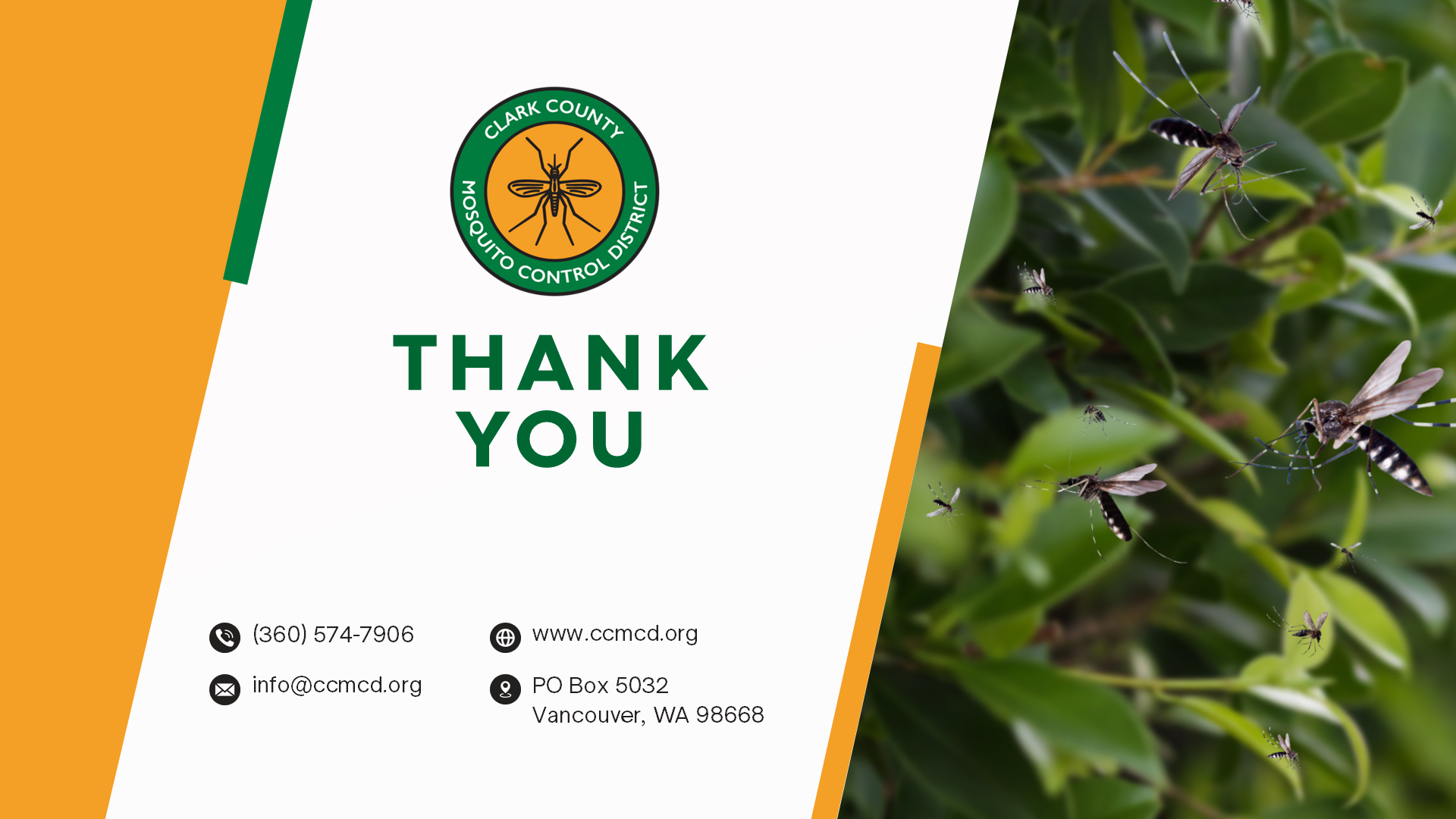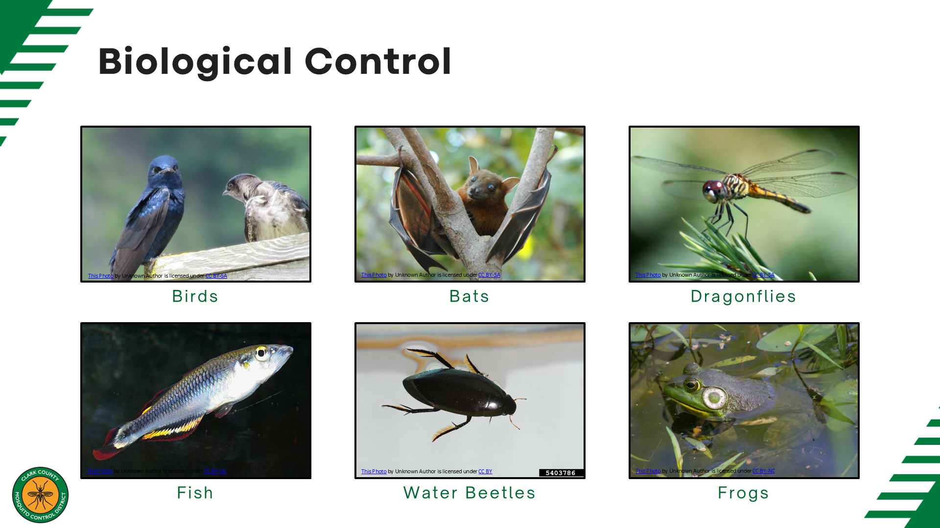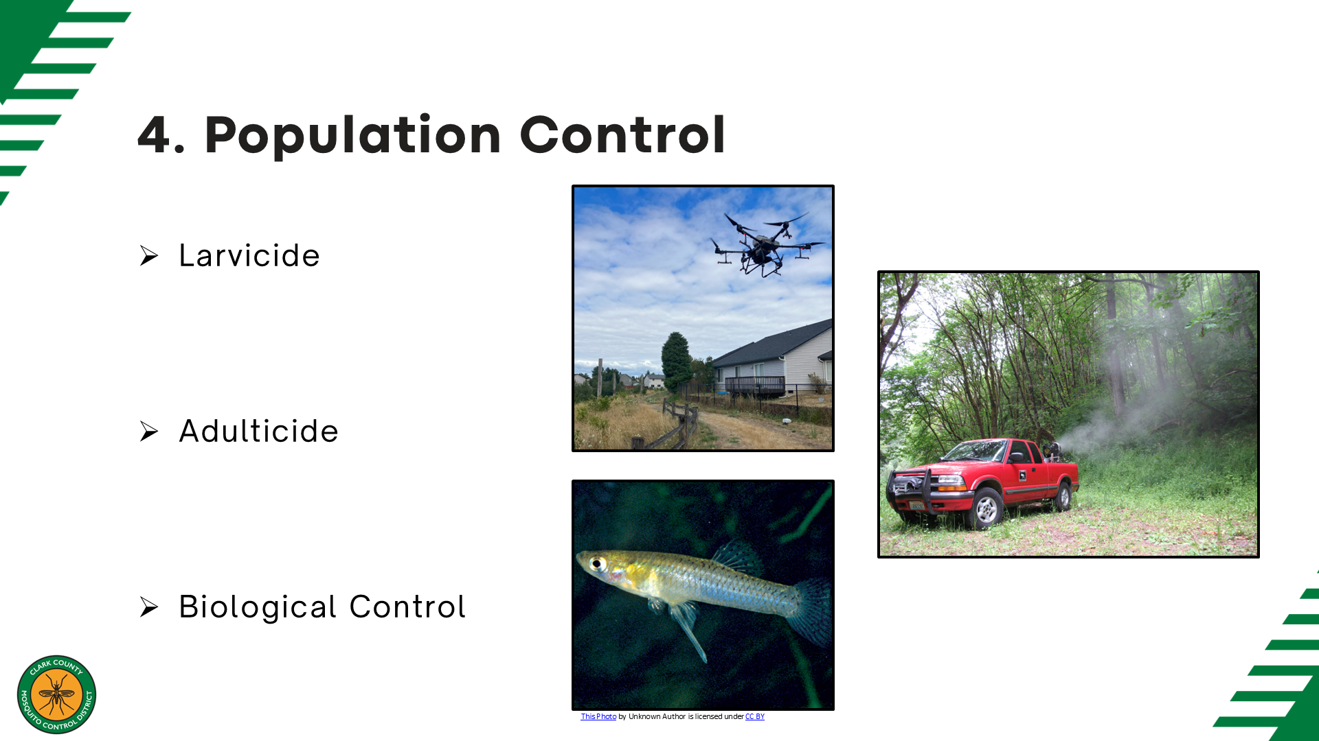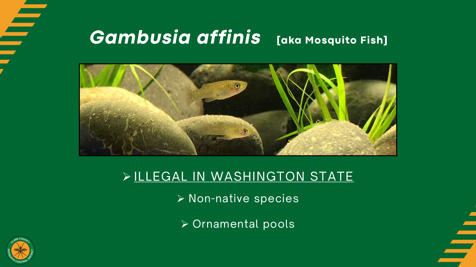 - Using natural enemies or biological agents, such as larvivorous fish or bacteria that target mosquito larvae. Please note that Gambusia affinis (Mosquito Fish) are illegal in Washington state.