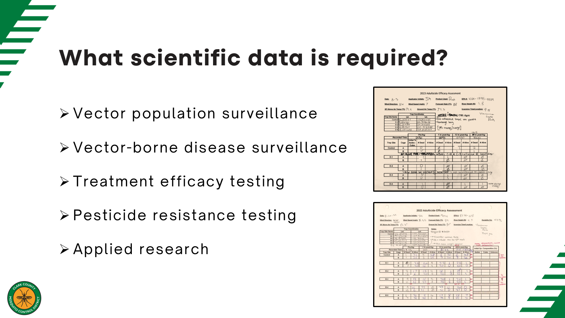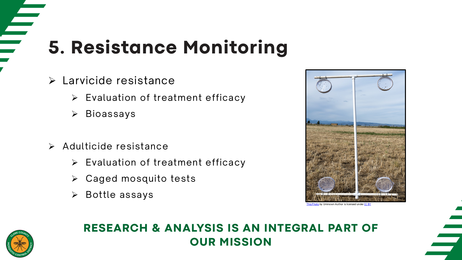 Evaluation of treatment efficacy, both larval and adult, through bioassays, caged mosquito tests, and bottle assays.
