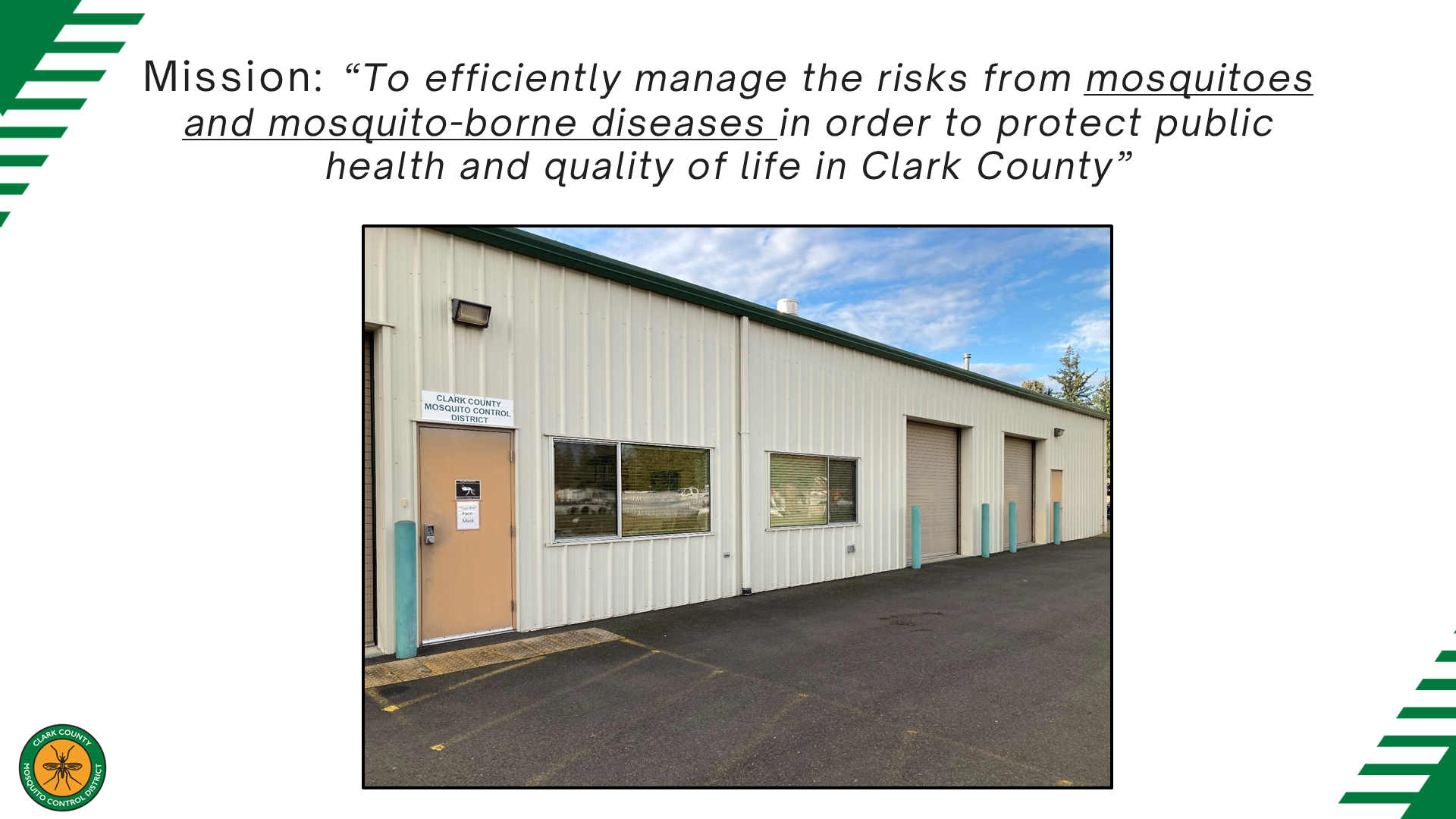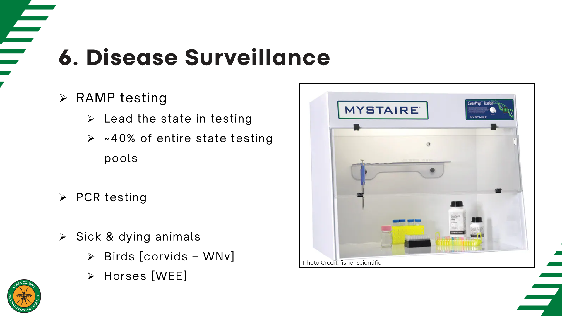 Testing for mosquito-borne diseases via Polymerase Chain Reaction (PCR) or Rapid Analyte Measurement Platform (RAMP), as well as monitoring for trends in sick or dying birds or equine.