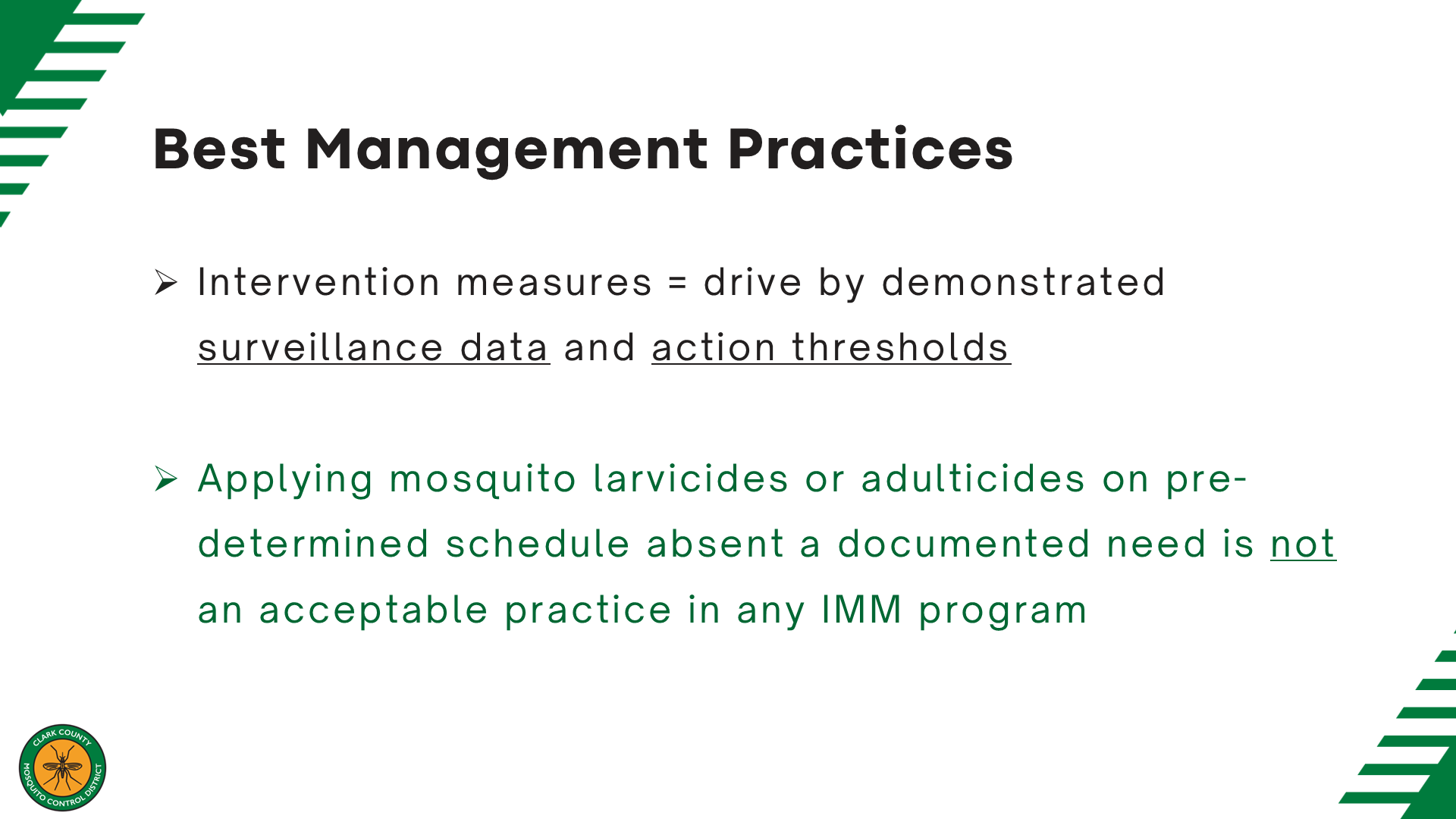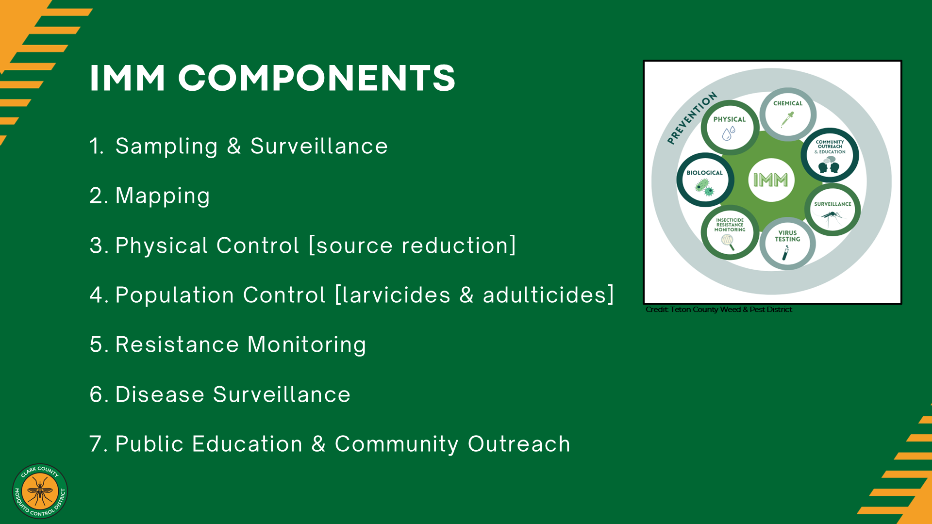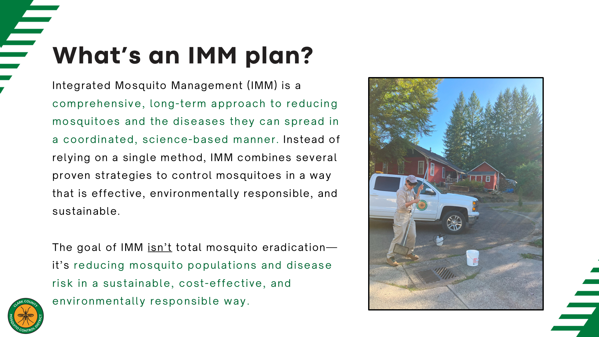 IMM helps protect public health by reducing the risk of mosquito-borne diseases while also minimizing impacts on people, pets, and the environment. It allows a district to respond effectively to mosquito problems while using the least amount of chemical control needed.